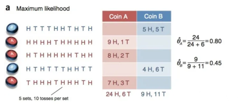 假设有两枚硬币 A 和 B,并已知实验数据属于A还是B,他们的随机抛掷的结果如下图所示: