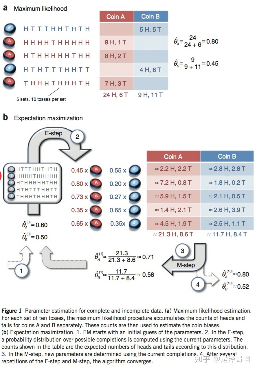 其解决方法就是先随机初始化\(\theta_A\)和\(\theta_B\),然后用去估计 Z, 然后基于 Z 按照最大似然概率去估计新的\(\theta_A\)和\(\theta_B\),循环至收敛。