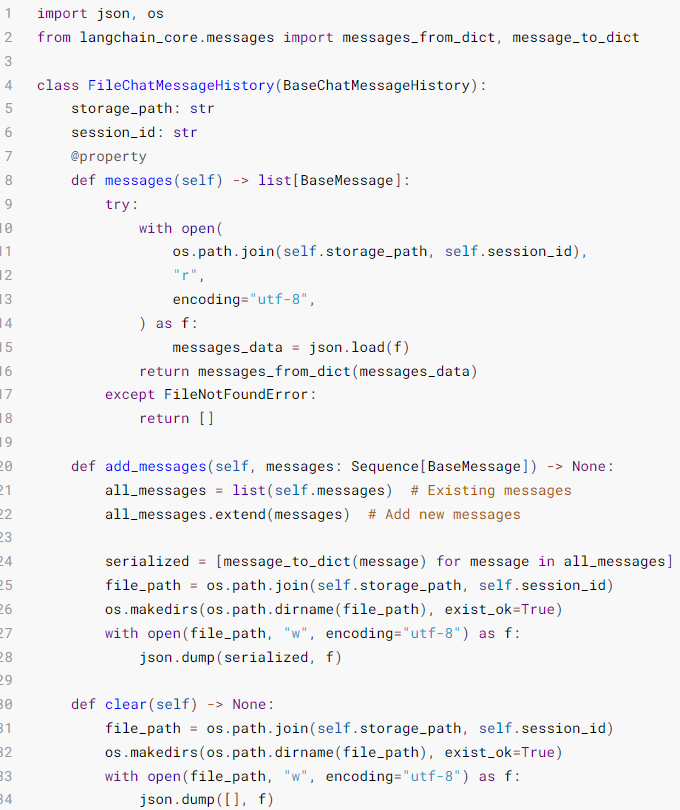 官方在BaseChatMessageHistory类的注释中提供了一个基于文件存储的示例模板代码如下: