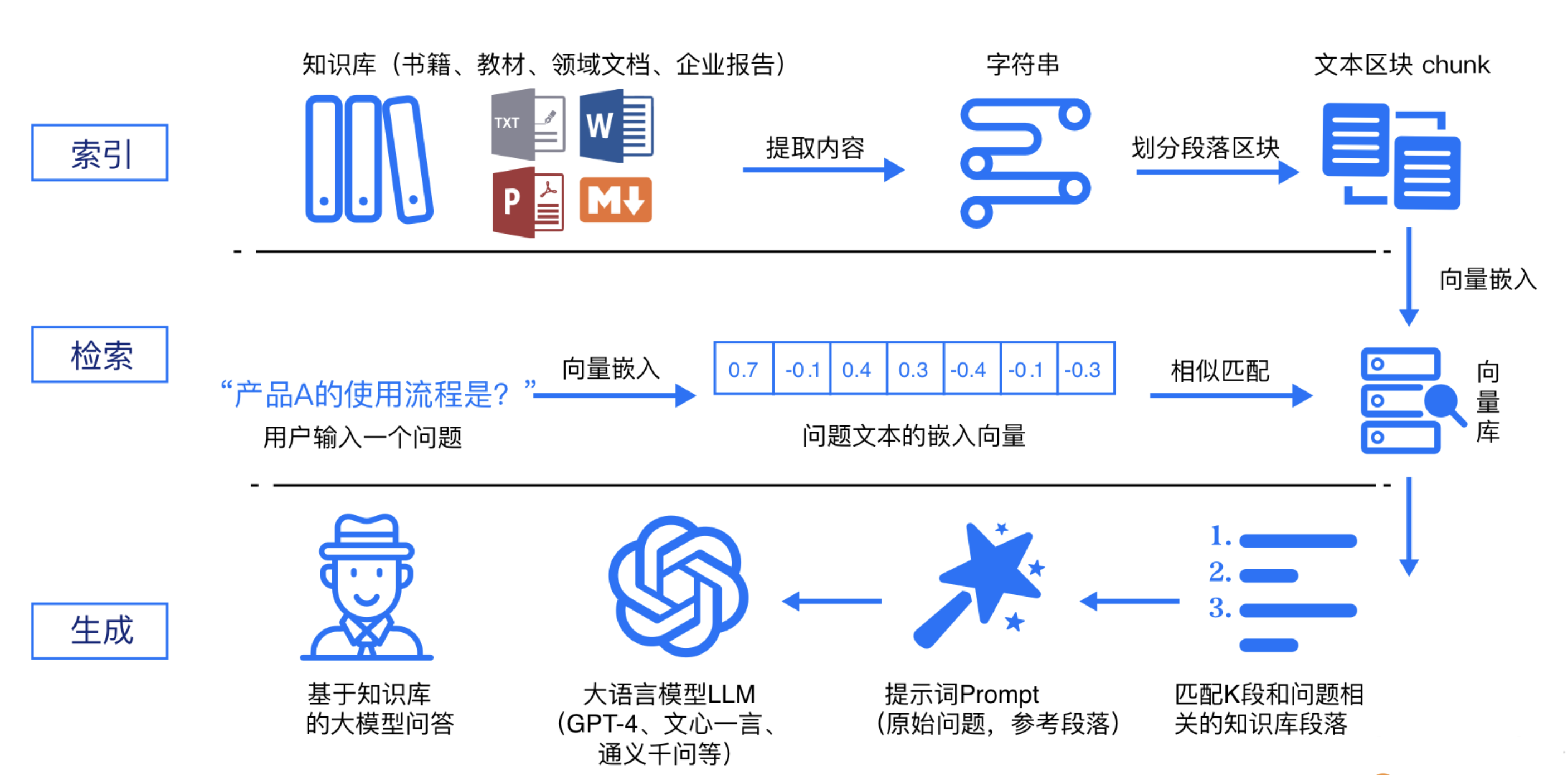 * 检索阶段,用户输入的查询(query)被转化为向量表示,通过相似度匹配从向量数据库中检索出最相关的文本块。