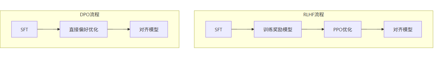 ✅ 优点: * 流程简化,无需 RM 和 PPO,工程门槛低 * 计算效率高,训练速度提升 3-5 倍,显存占用下降 40% * 训练稳定,无 RM 偏差传递,无 PPO 不稳定性 * 对齐效果接近 RLHF,部分任务可达 90%+ 性能