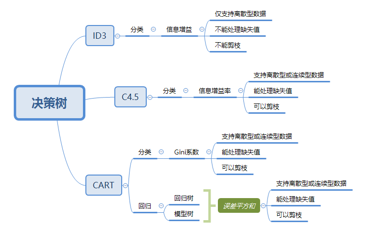 ID3和C4.5算法,生成的决策树是多叉树,只能处理分类不能处理回归。而CART(classification and regression tree)分类回归树算法,既可用于分类也可用于回归。 分类树的输出是样本的类别, 回归树的输出是一个实数。