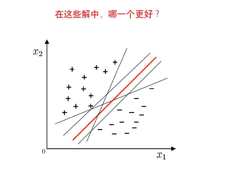 应选择“正中间”, 容忍性好, 鲁棒性高, 泛化能力最强的分类平面。