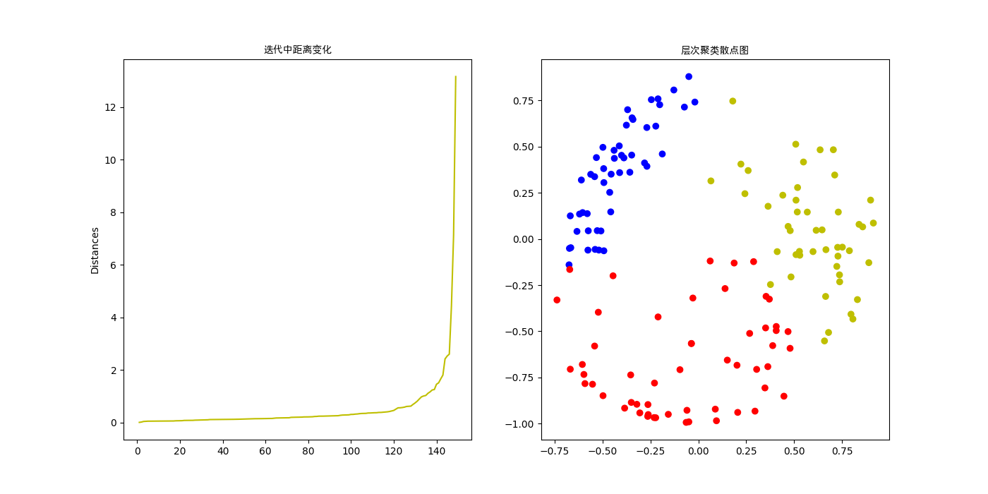 ax1.set_title("迭代中距离变化",fontproperties='SimHei') #相当于所在迭代次数的根节点,对应子节点(两类)的距离