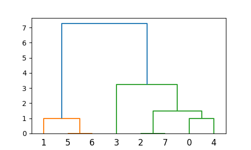 注意:linkage方法返回一个矩阵,一共有8个元素,需要进行7次聚类,所以Z有7行。每一行有四个元素,前两个是进行cluster操作的向量的索引值,第三个是dist,第四个是该类目前有几个元素。在生成新的cluster后,其会被赋予索引值8,9,10等,一点一点往上加,这也是为什么只有8个元素但是最后几行的索引值有10+。