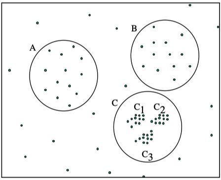 如果设置较大的\(\epsilon\),将会获得A,B,C这3个簇。如果设置较小的\(\epsilon\),将会只获得C1、C2、C3这3个簇。