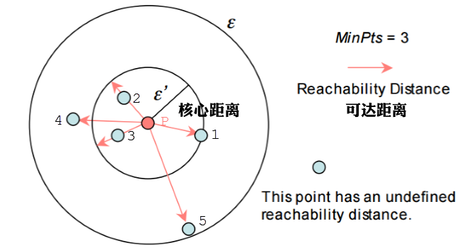 举例,下图中假设minPts=3,半径是ε。那么P点的核心距离是d(1,P),点2的可达距离是d(1,P),点3的可达距离也是d(1,P),点4的可达距离则是d(4,P)的距离。