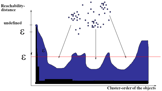 该算法最终获取知识是一个输出序列,该序列按照密度不同将相近密度的点聚合在一起,而不是输出该点所属的具体类别,如果要获取该点所属的类型,需要再设置一个参数\(\epsilon_i\)(一般取最低峰值偏下一点的y值)提取出具体的类别。如下图所示: