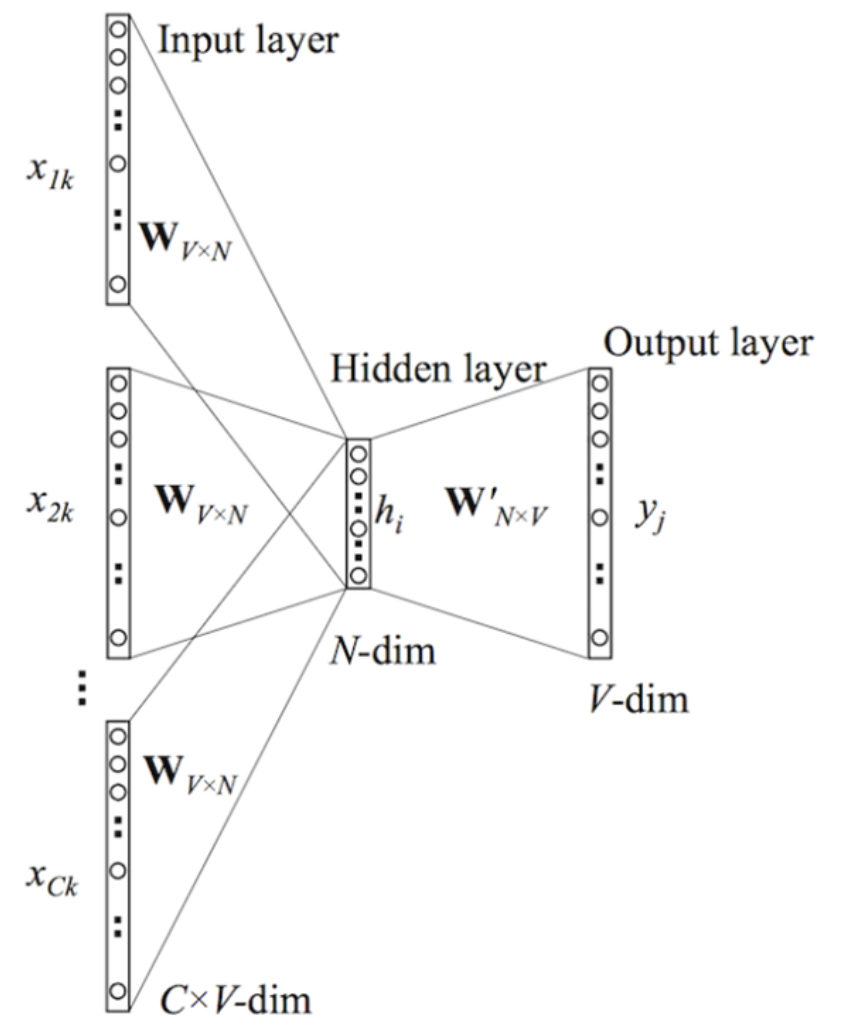 输入层由目标词汇y的上下文单词\({x_1,...x_c}\)组成,\(x_i\) 是被onehot编码过的V维向量,其中V是词汇量;隐含层是N维向量h;输出层是被onehot编码过的目标词y。输入向量通过 \(V*N\) 维的权重矩阵W连接到隐含层;隐含层通过 \(N*V\) 维的权重矩阵\(W'\)连接到输出层。因为词库V往往非常大,使用标准的softmax计算相当耗时,于是CBOW的输出层采用的正是上文提到过的分层Softmax。
