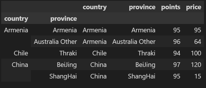 reviews.groupby('country').apply(lambda df:df.province.iloc[:]) #若iloc[0],则返回每组第一个province