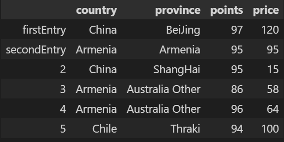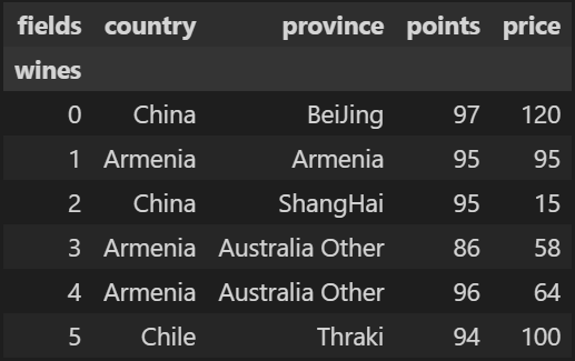 reviews.rename_axis('wines',axis='rows').rename_axis('fields',axis='columns') #给行列索引命名,rows可以替换为1,columns替换为0